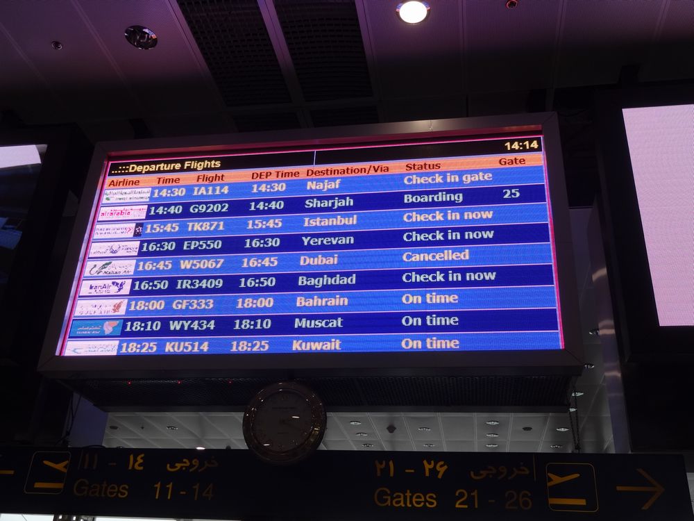 飛行場出発ロビーにて、 中東行のフライトが沢山あり。今はそこを攻撃するとは?
