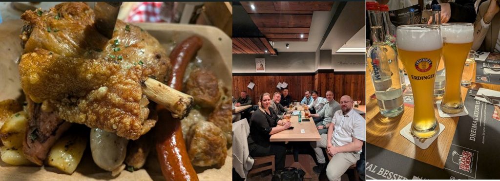 3日間の開催の最終日、TROESTER各拠点のメンバーと打ち上げ会を実施。ドイツといえばビール!みんなで3日間の労を癒す乾杯をして、親睦を深めました。ドイツ料理でとても美味しいのがシュバイネハクセ(豚の足をローストしたもの)。大好きな一品です。最高に美味しいドイツビールとシュパイネハクセで、往路で疲れた心が癒されました!